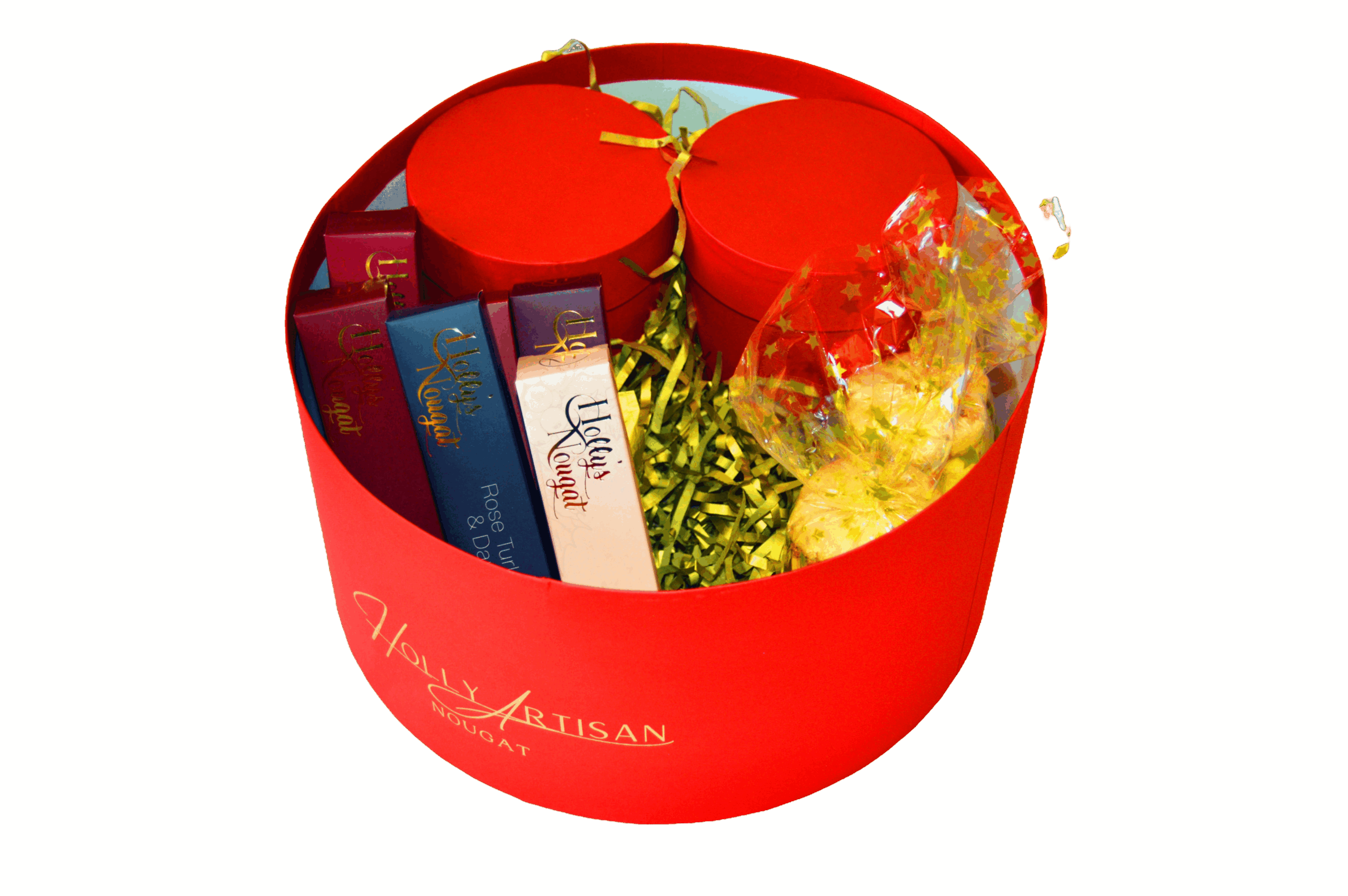 Our beautifully presented Hat Boxes are filled with a delightful selection of our premium nougat treats, offering a mix of irresistible flavors. Whether you choose the Medium or Large size, each box includes a variety of delicious nougat bars and biscuits, expertly crafted for indulgence. Ideal for gifting or treating yourself, the Hat Box is a thoughtful and luxurious way to enjoy a selection of sweet, nutty, and flavorful delights. Select the Medium for a perfect smaller treat, or go for the Large for a more generous assortment to share and savor.