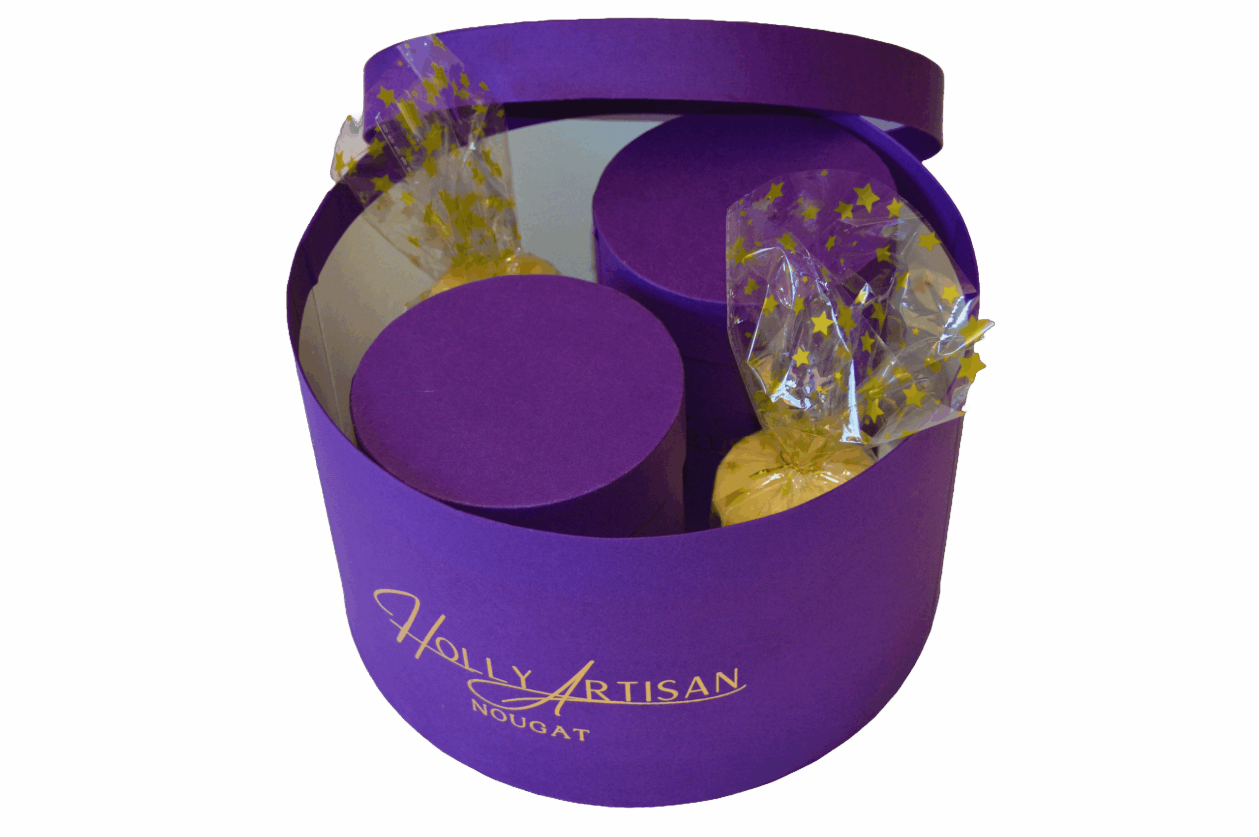 Our beautifully presented Hat Boxes are filled with a delightful selection of our premium nougat treats, offering a mix of irresistible flavors. Whether you choose the Medium or Large size, each box includes a variety of delicious nougat bars and biscuits, expertly crafted for indulgence. Ideal for gifting or treating yourself, the Hat Box is a thoughtful and luxurious way to enjoy a selection of sweet, nutty, and flavorful delights. Select the Medium for a perfect smaller treat, or go for the Large for a more generous assortment to share and savor.